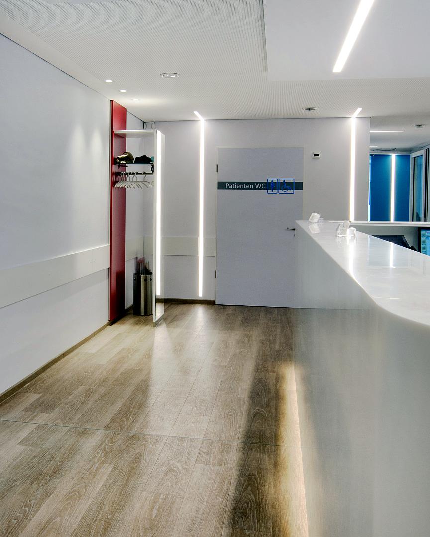 Unser Büro erstellte das Farb- und Materialkonzept für Wand-, Boden- und Deckengestaltung, sowie für die gesamte Einrichtung, einschließlich der Fensterdeko, und der Beschilderung. Des Weiteren die Elektroinstallations- und Beleuchtungsplanung, sowie die gesamte Ausschreibung, Vergabe und Bauüberwachung, für die Einrichtung und Ausstattung der Praxis.