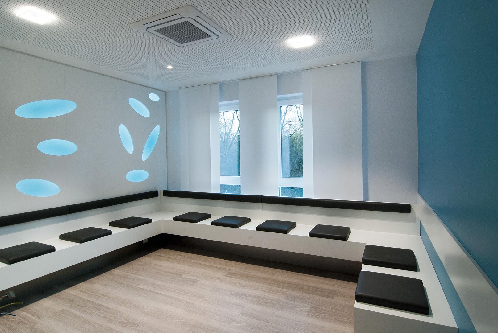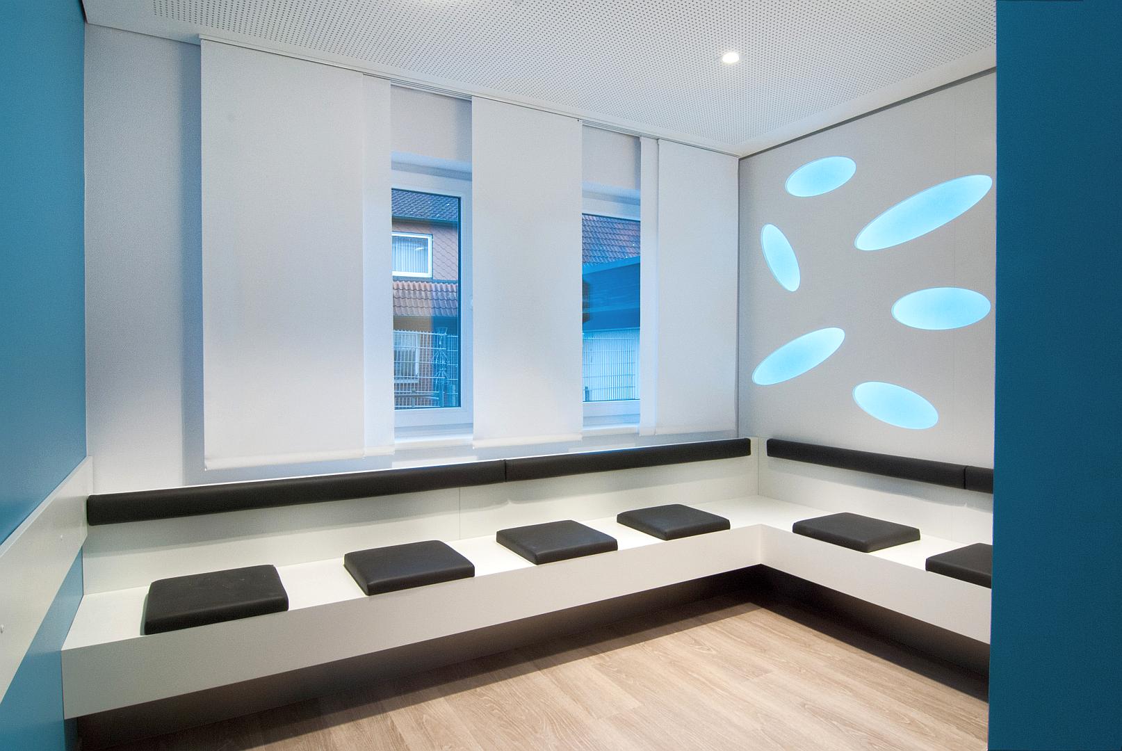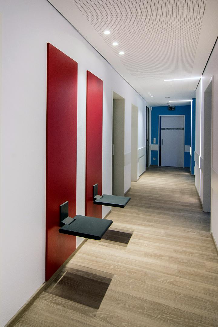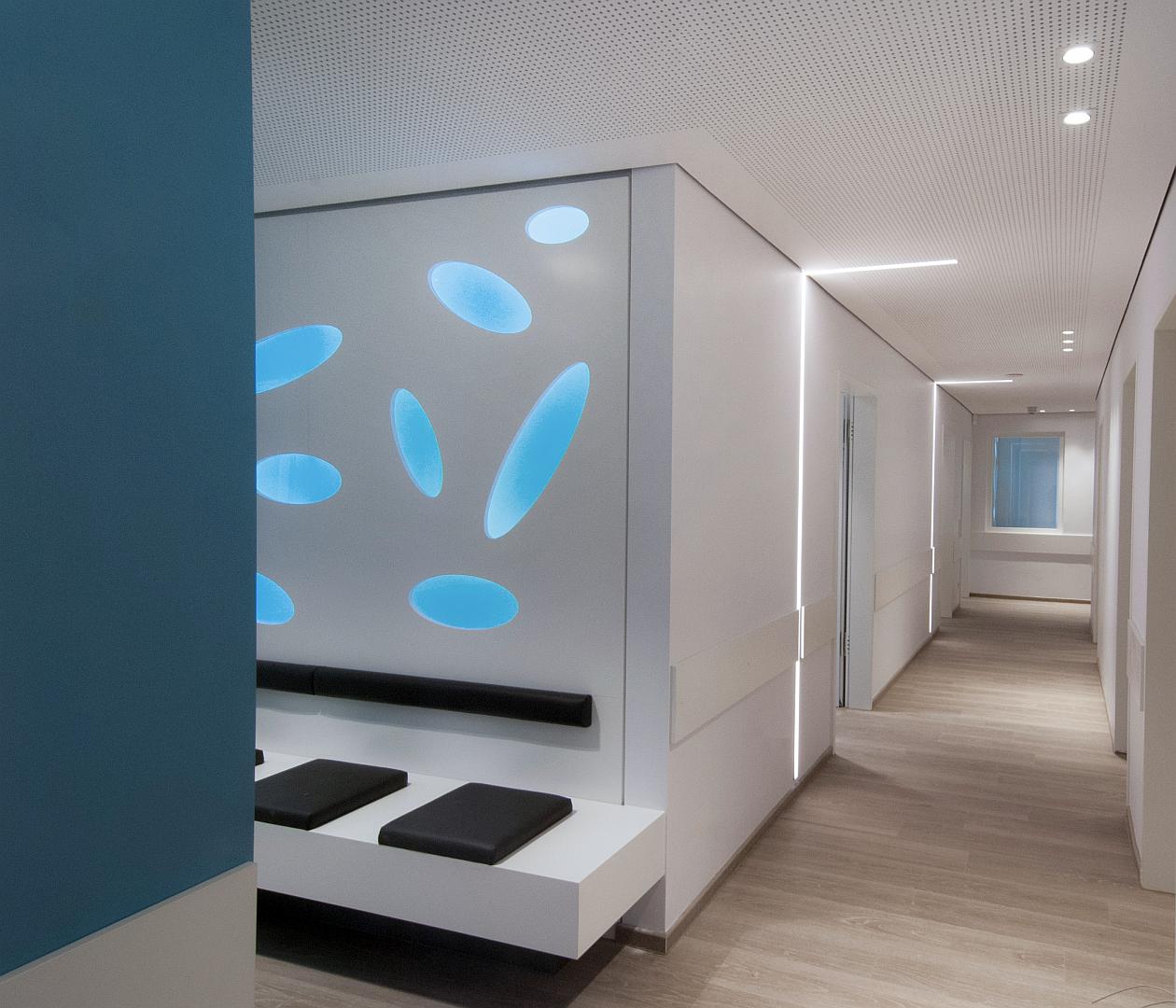 Die Voruntersuchungs- und Untersuchungsräume wurden in einzelnen Raumgruppen zusammengefasst, die jeweils über eigene Wartezonen verfügen. Auf diese Weise wird der Behandlungsablauf, auch bei sehr hohen Patientenfrequenzen, übersichtlich und ökonomisch. Diese Behandlungsbereiche der jeweiligen Ärzte werden optisch durch individuelle Blaufarbtöne gekennzeichnet, die sich in den Wartezonen und den Untersuchungsräumen wieder finden. Um die langen Flure zu strukturieren wurden Lichtprofile in die Wände und die Decken eingelassen, sowie Vorwarteplätze mit einer markanten Farbgestaltung, den Funktionsräumen zugeordnet.