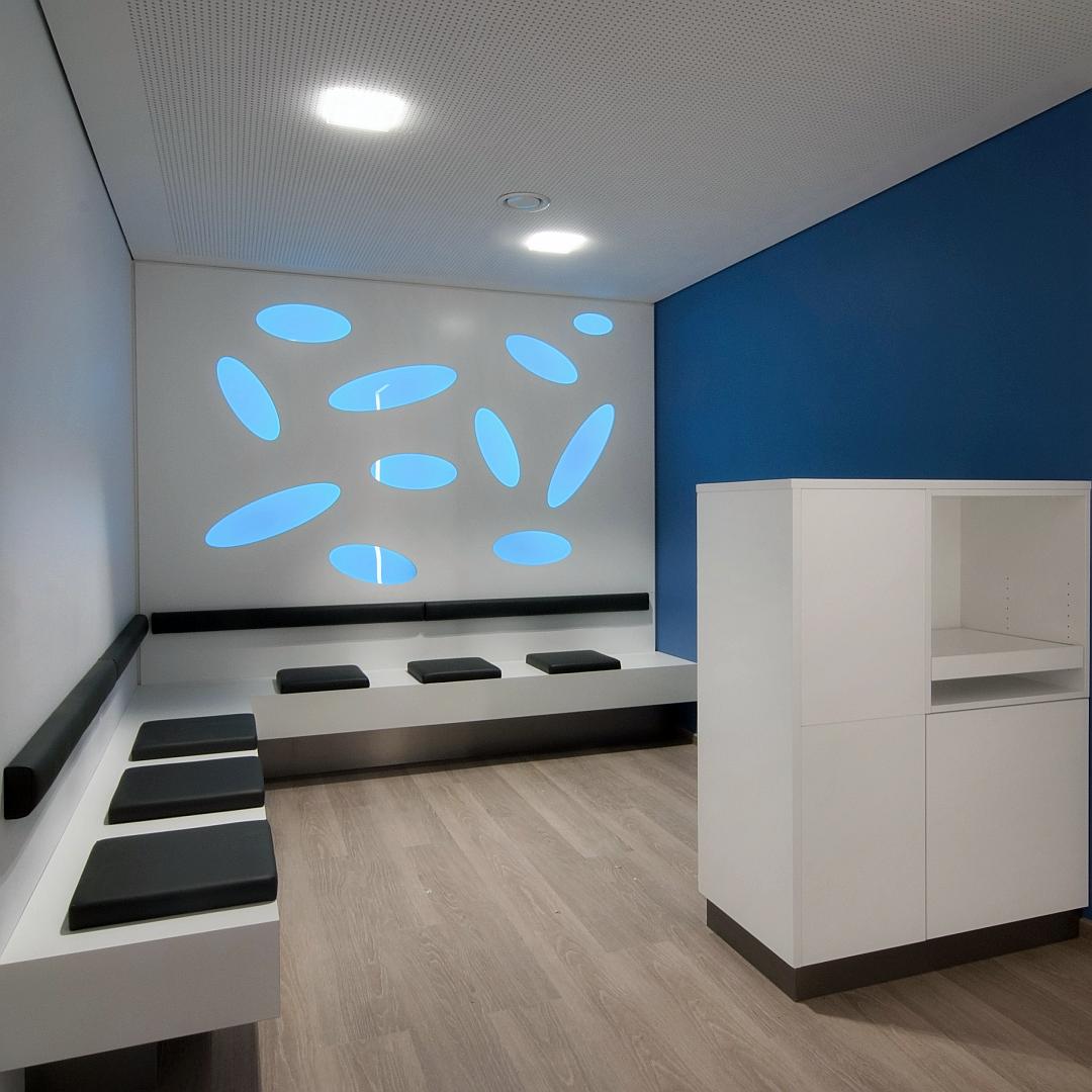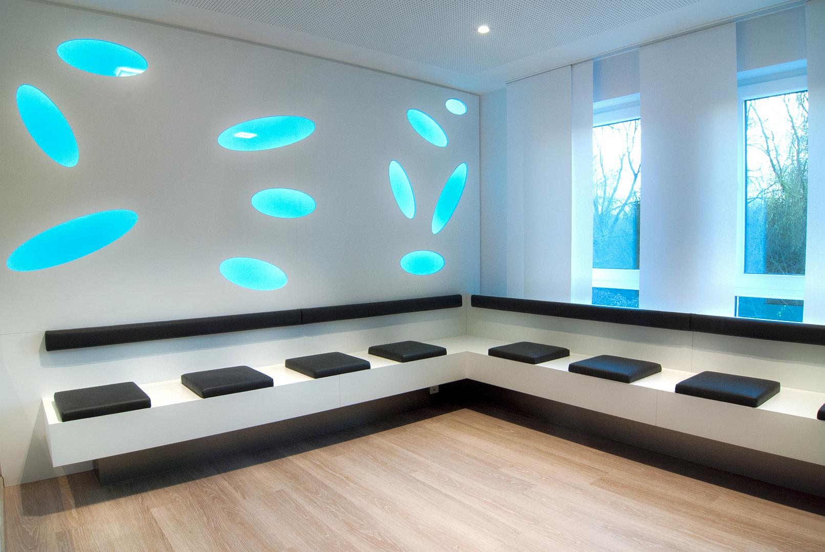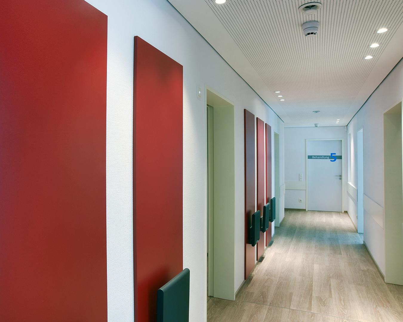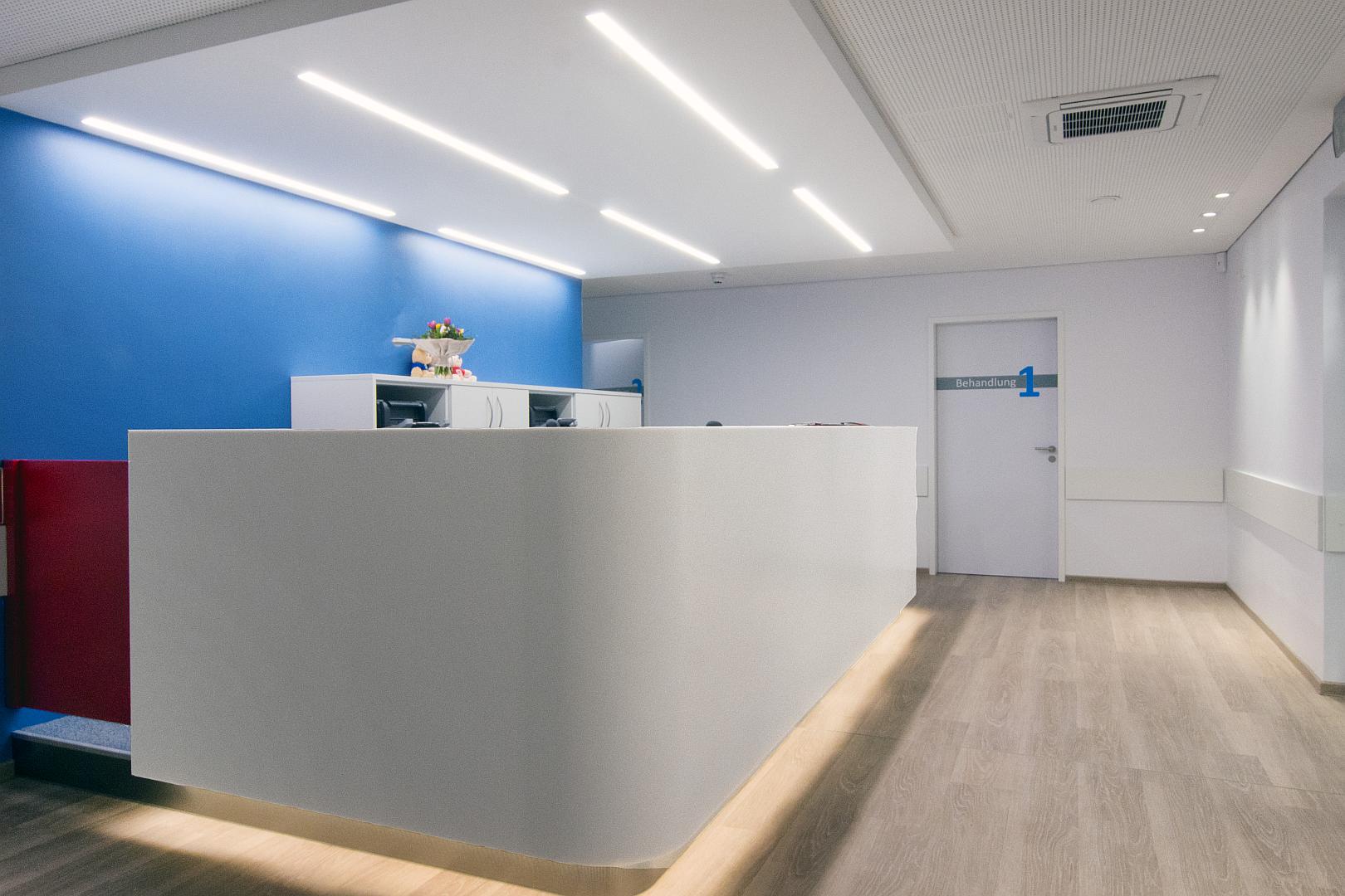 Die Voruntersuchungs- und Untersuchungsräume wurden in einzelnen Raumgruppen zusammengefasst, die jeweils über eigene Wartezonen verfügen. Auf diese Weise wird der Behandlungsablauf, auch bei sehr hohen Patientenfrequenzen, übersichtlich und ökonomisch. Diese Behandlungsbereiche der jeweiligen Ärzte werden optisch durch individuelle Blaufarbtöne gekennzeichnet, die sich in den Wartezonen und den Untersuchungsräumen wieder finden. Um die langen Flure zu strukturieren wurden Lichtprofile in die Wände und die Decken eingelassen, sowie Vorwarteplätze mit einer markanten Farbgestaltung, den Funktionsräumen zugeordnet.