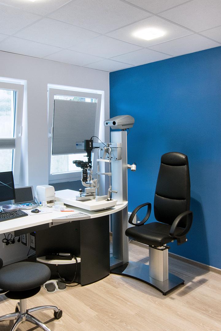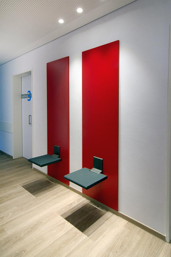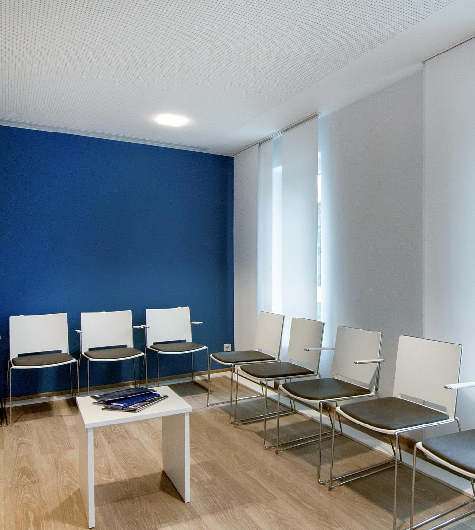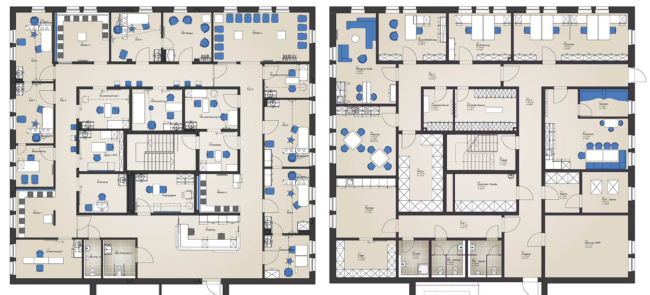 Die Voruntersuchungs- und Untersuchungsräume wurden in einzelnen Raumgruppen zusammengefasst, die jeweils über eigene Wartezonen verfügen. Auf diese Weise wird der Behandlungsablauf, auch bei sehr hohen Patientenfrequenzen, übersichtlich und ökonomisch. Diese Behandlungsbereiche der jeweiligen Ärzte werden optisch durch individuelle Blaufarbtöne gekennzeichnet, die sich in den Wartezonen und den Untersuchungsräumen wieder finden. Um die langen Flure zu strukturieren wurden Lichtprofile in die Wände und die Decken eingelassen, sowie Vorwarteplätze mit einer markanten Farbgestaltung, den Funktionsräumen zugeordnet.