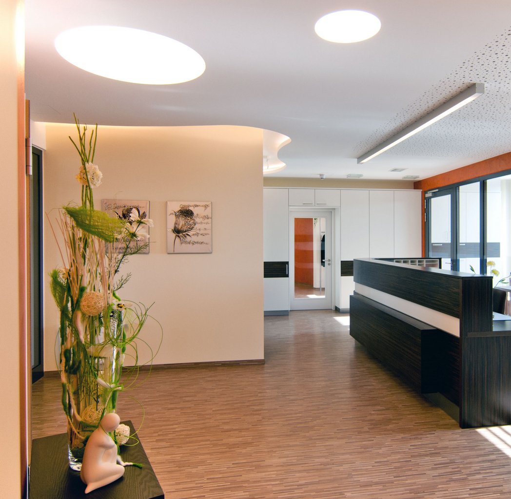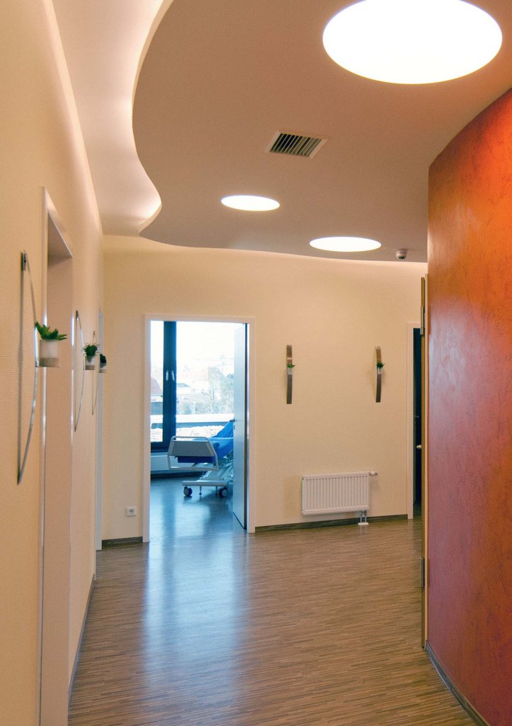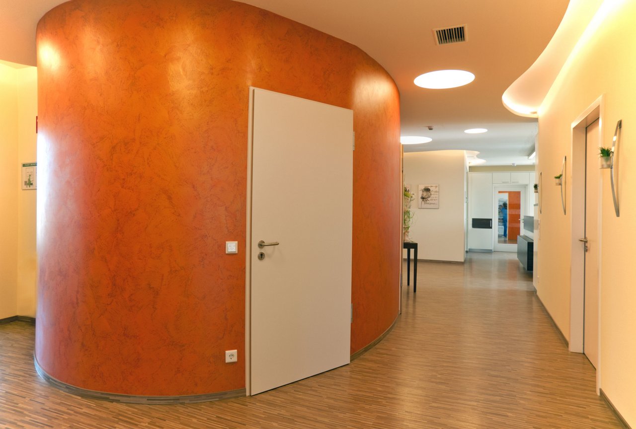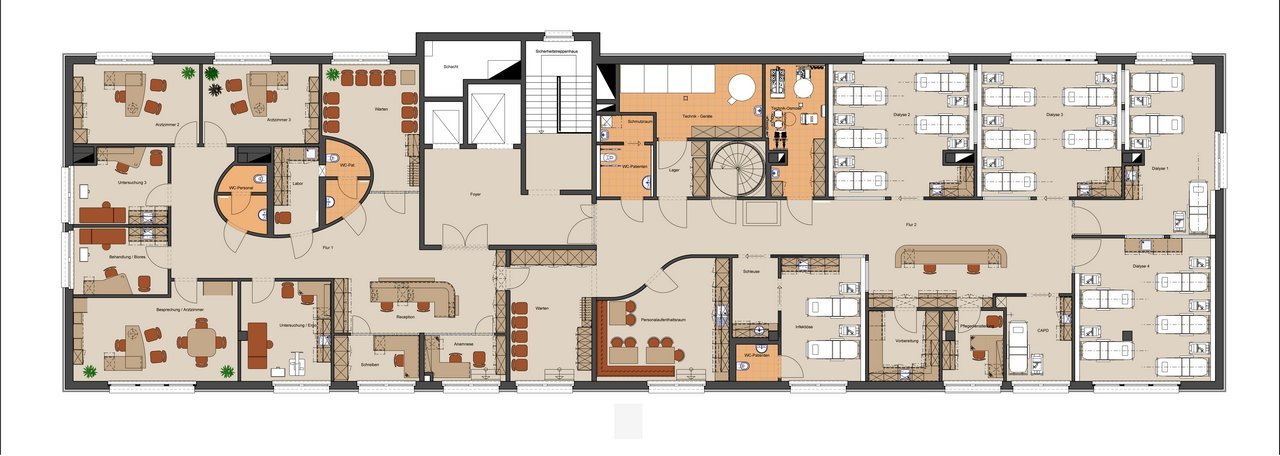 Für besondere Infektionskrankheiten, mit hohem Krankheitspotential wie MRSA, ESBL, Hepatitis, HIV und EHEC, wurden spezielle Isolationsräume mit ¬Schleusen geschaffen. Hier können, unter strengsten Hygienevorschriften, bis zu 3 infektiöse Patienten gleichzeitig dialysiert werden. Auf Grund unserer Erfahrung bei einer Vielzahl von durchgeführten Projekten in dieser Fachrichtung, mit einer Größenordnung von bis zu 60 Dialyseplätzen, konnten wir unsere ganze Fachkenntnis einbringen und ein für den Betreiber und die Patienten optimales Dialysezentrum konzipieren, welches als internistisch-¬nephrologische Schwerpunktpraxis nach DIN EN ISO 9001 zertifiziert ist, und regelmäßig auditiert wird, nach i-med-cert. Unsere Leistung umfasste die Grundrissplanung, die Integration der Medizintechnik, die gesamte innenarchitektonische Praxisgestaltung, einschließlich der Möbel- und Einrichtungsplanung. Des Weiteren die Erstellung eines individuellen Licht- und Farbkonzeptes, dass sich durch warme Akzentfarben und eine dezente, indirekte Beleuchtung auszeichnet, um den Patienten den langen Aufenthalt in den Räumen möglichst angenehm zu gestalten.