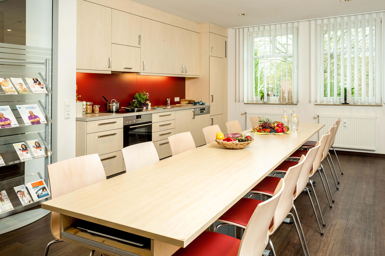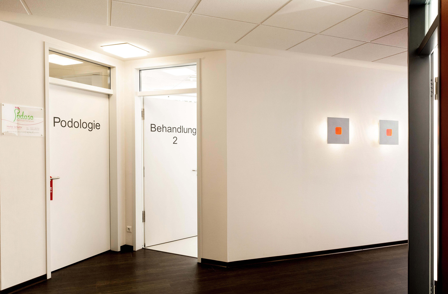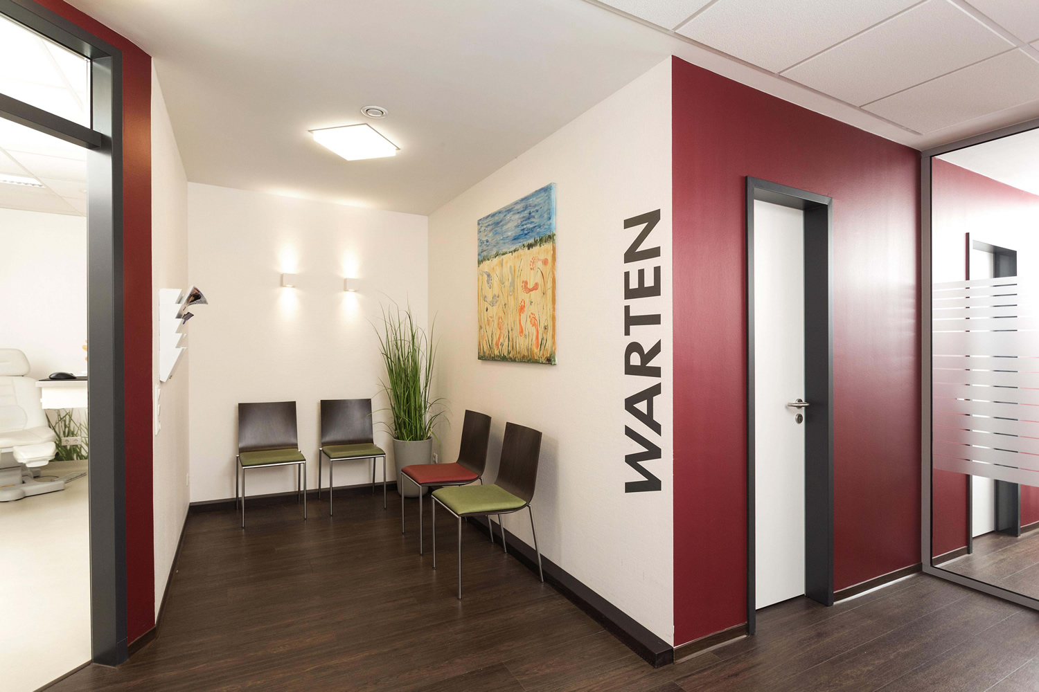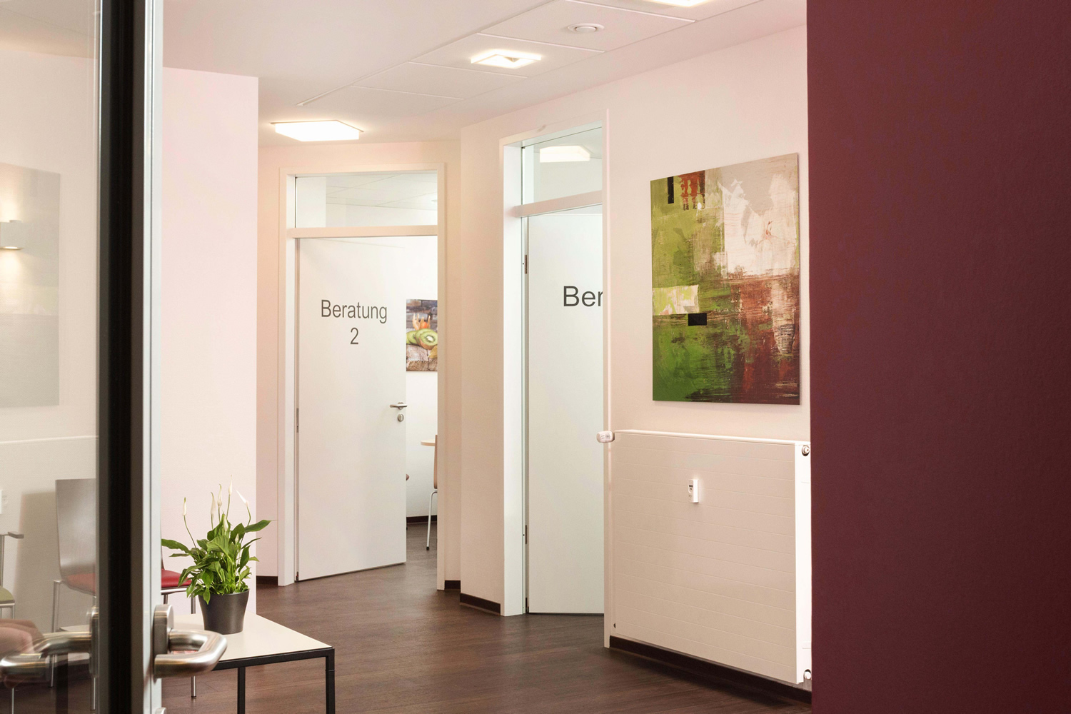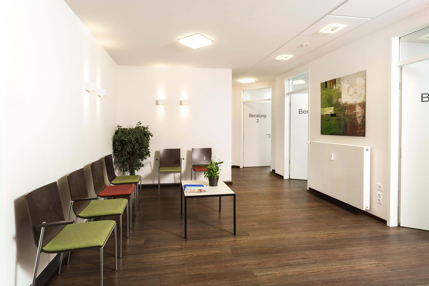 Die neu dazu kommenden Räume, die vorher von einer urologischen Praxis genutzt wurden, wurden fast vollständig entkernt und neu aufgeteilt. Direkt im alten Empfangsbereich wurde ein großzügiger Durchbruch in den neuen Praxisteil geschaffen der, auf Grund der großzügigen Dimensionierung, den alten und den neuen Praxisteil nicht nur verbindet, sondern als eine Einheit wirken lässt. Im neuen Praxisteil wurden primär die Beratungsräume für die Diabetesberatung platziert, sowie ein neuer Schulungsraum, einschließlich einer Schulungsküchenzeile. Da dadurch einige Räume in den „alten“ Räumen frei wurden, wurden auch hier umfangreiche Raumänderungen notwendig, um diese den geänderten Funktionsabläufen anzupassen. Weiterhin wurden zusätzliche Wartezonen implementiert. Die neuen, sowie die vom Umbau betroffenen Bereiche der alten Praxis wurden gestalterisch miteinander verbunden, angefangen über die Bodenbeläge, die Farbgestaltung der Wände, sowie der Beleuchtung, die alle auf Grund der noch lieferbaren Produkte eine harmonische Einheit bilden, bei der niemand einen alten oder einen neuen Praxisteil erkennen kann. Dadurch, sowie durch die großflächigen Glastrennwände, die das Tageslicht bis in die innenliegenden Praxisteile bringen, ergibt sich ein attraktiver, großzügiger Raumeindruck, der bei den Patienten und beim gesamten Praxisteam gut ankommt.