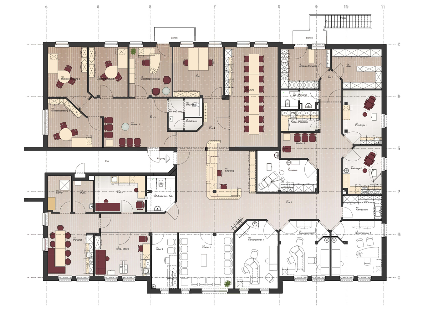 Diese Diabetes-Schwerpunktpraxis wurde im Jahre 2012/13 von uns geplant, und in den Räumen einer ehemaligen radiologischen Praxis, neu gebaut und eingerichtet. Im letzten Jahr wurde eine danebenliegende Praxisfläche, mit einer Gesamtfläche von ca. 150 m2, freigezogen. Dadurch ergab sich die Gelegenheit die Praxis zu erweitern, da sich zwischenzeitlich ein erhöhter Bedarf abzeichnete, und zusätzliche Räume für weitere Diabetesberater und für die Ärzte notwendig wurden.
