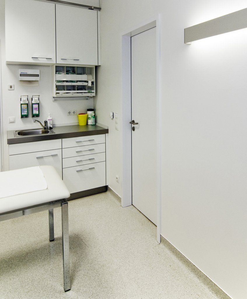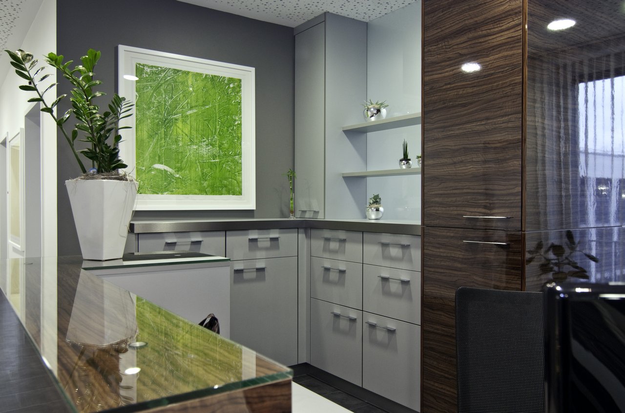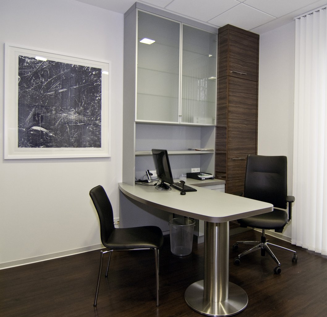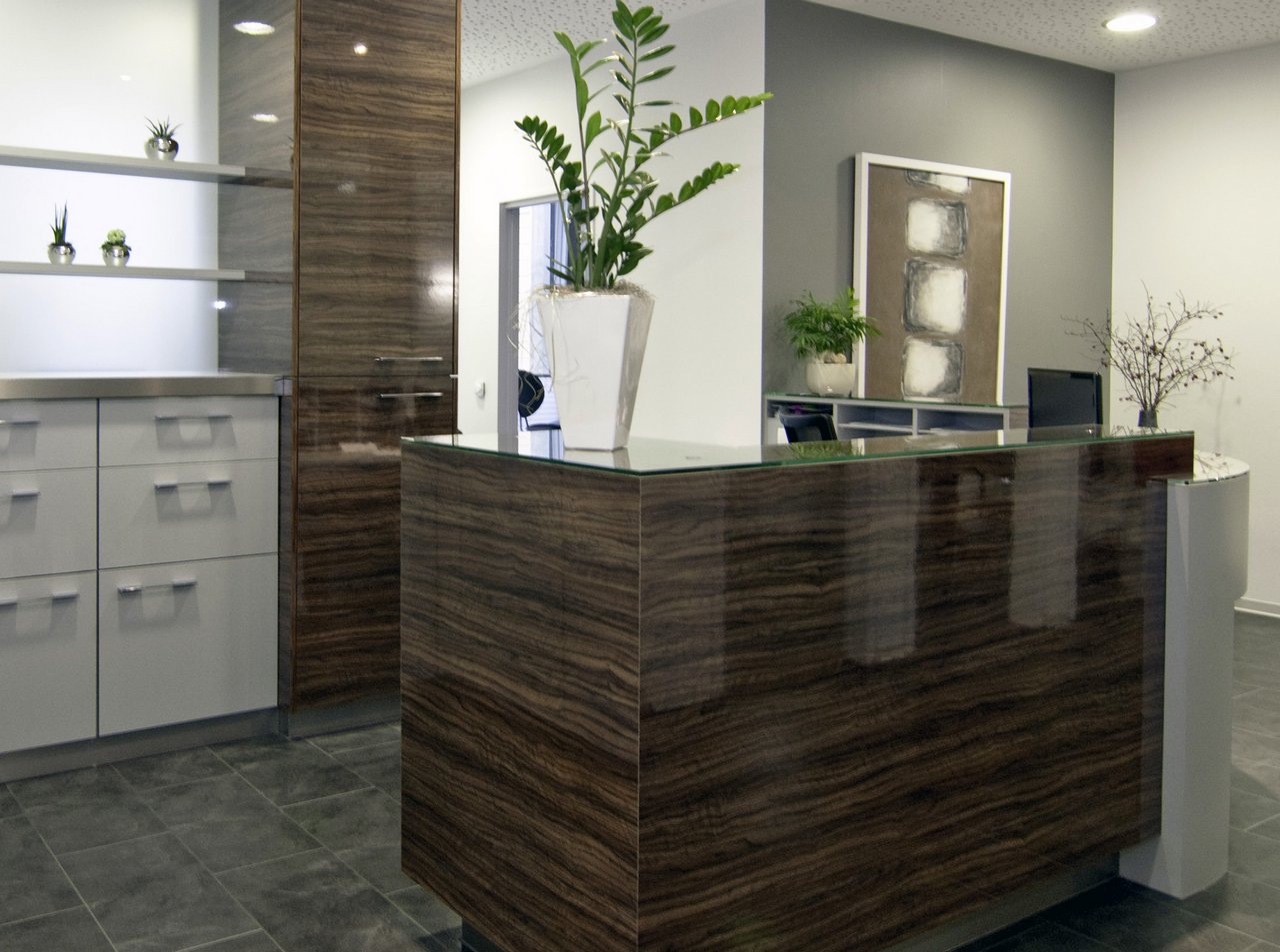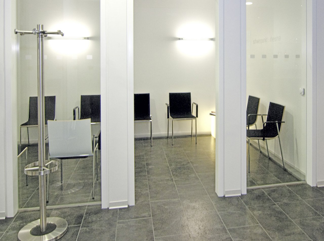 Klein aber fein lautet das Moto dieser Praxis. Es wurde viel Wert auf eine funktionsgerechte Aufteilung der relativ kleinen Fläche gelegt. Durch die Gebäudegeometrie ergab es sich, dass einige Räume ohne Tageslicht auskommen müssen. Durch die offene Gestaltung des Bürobereiches, der nur durch die Möblierung von der Reception getrennt wird, wurde der Eingangsbereich gut belichtet. Die subtile Farbgestaltung in zurückhaltenden Grautönen, in Verbindung mit hochwertigen Materialien, machen den Reiz dieser Praxis aus. Wir erbrachten die Leistungsphasen 1 – 9 der HOAI, die Funktions – und Innenraumplanung, einschließlich der Möbelplanung , das Farb- und Materialkonzept sowie die Planung der Beleuchtung, die auf die hochwertige Gestaltung abgestimmt ist.