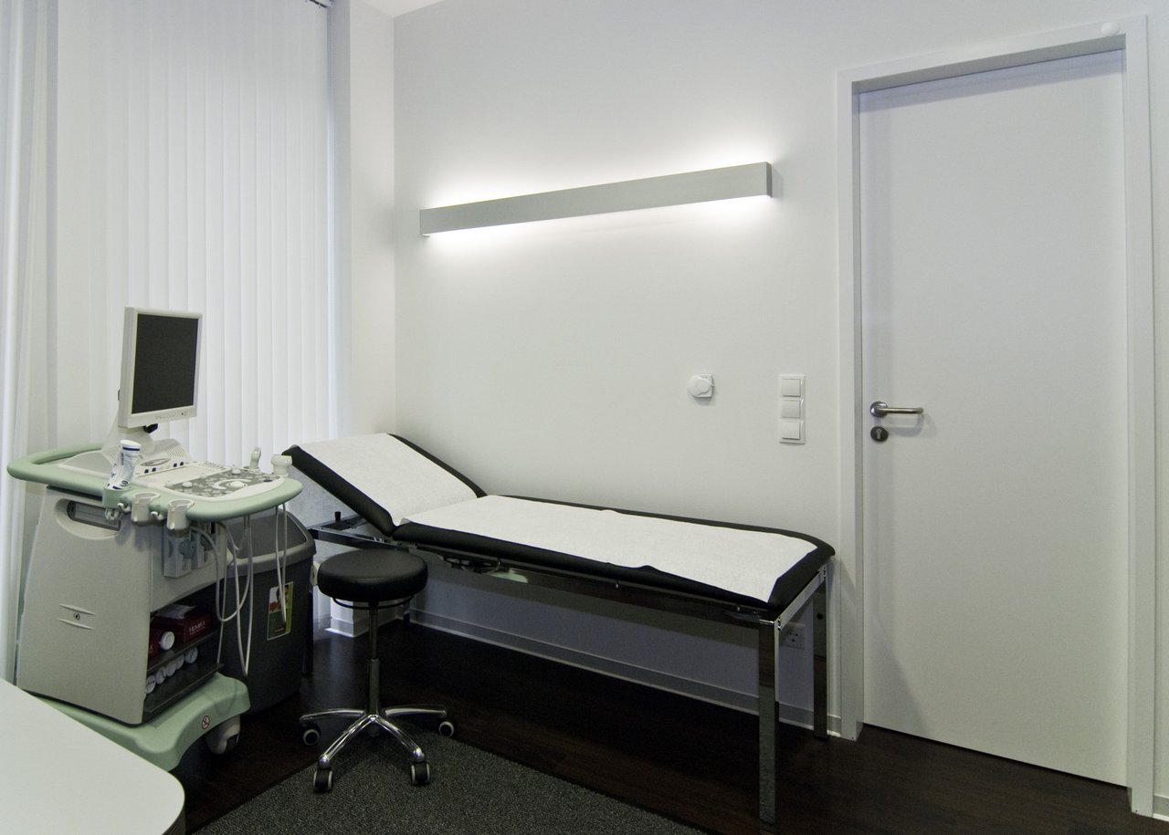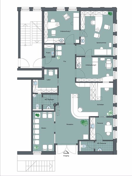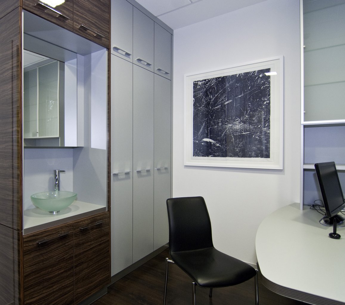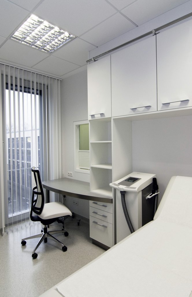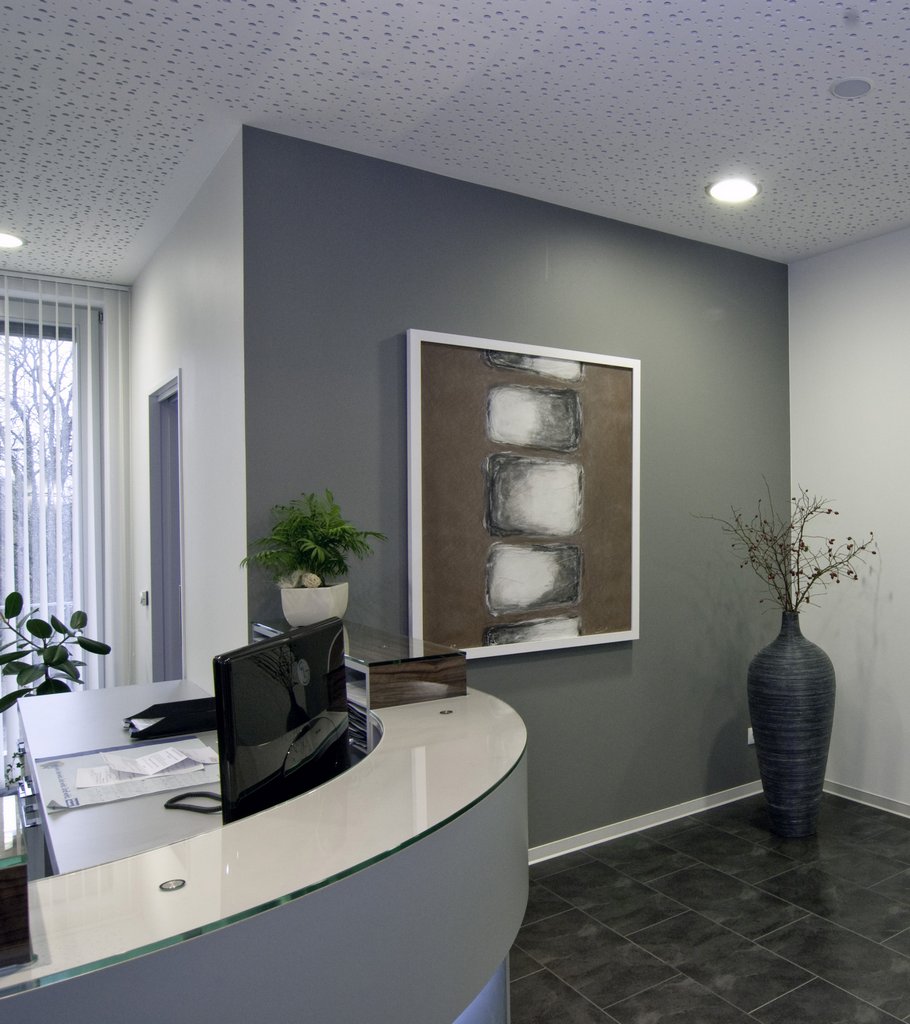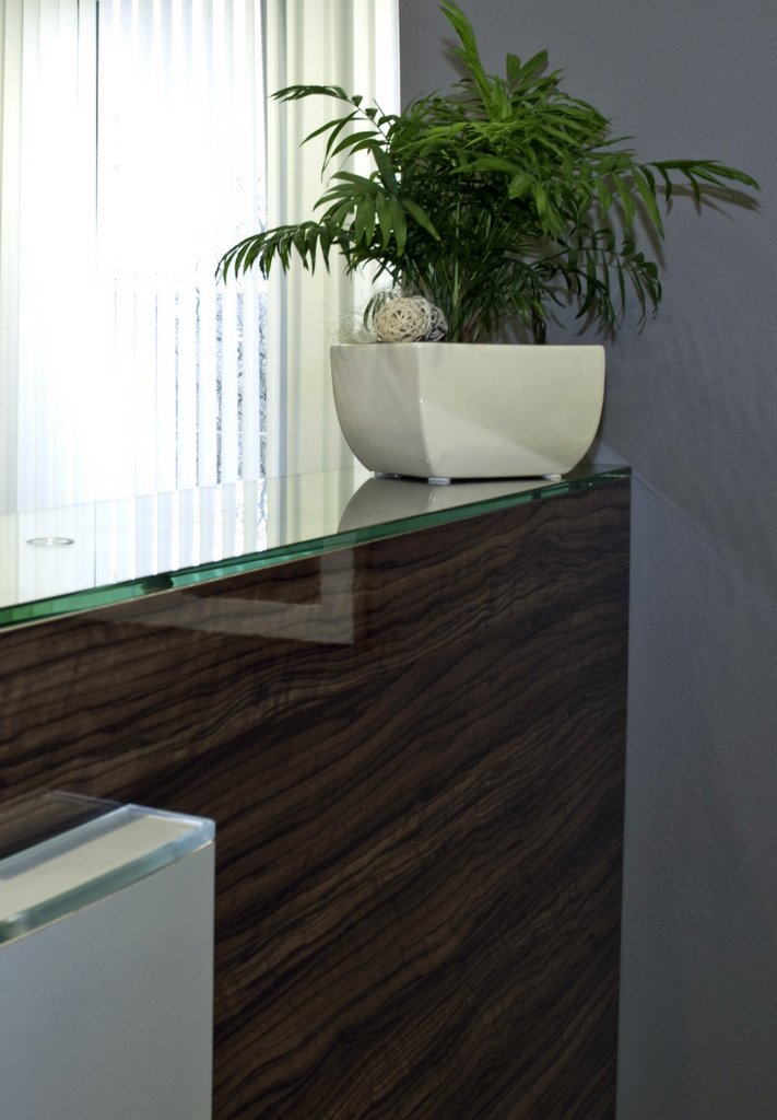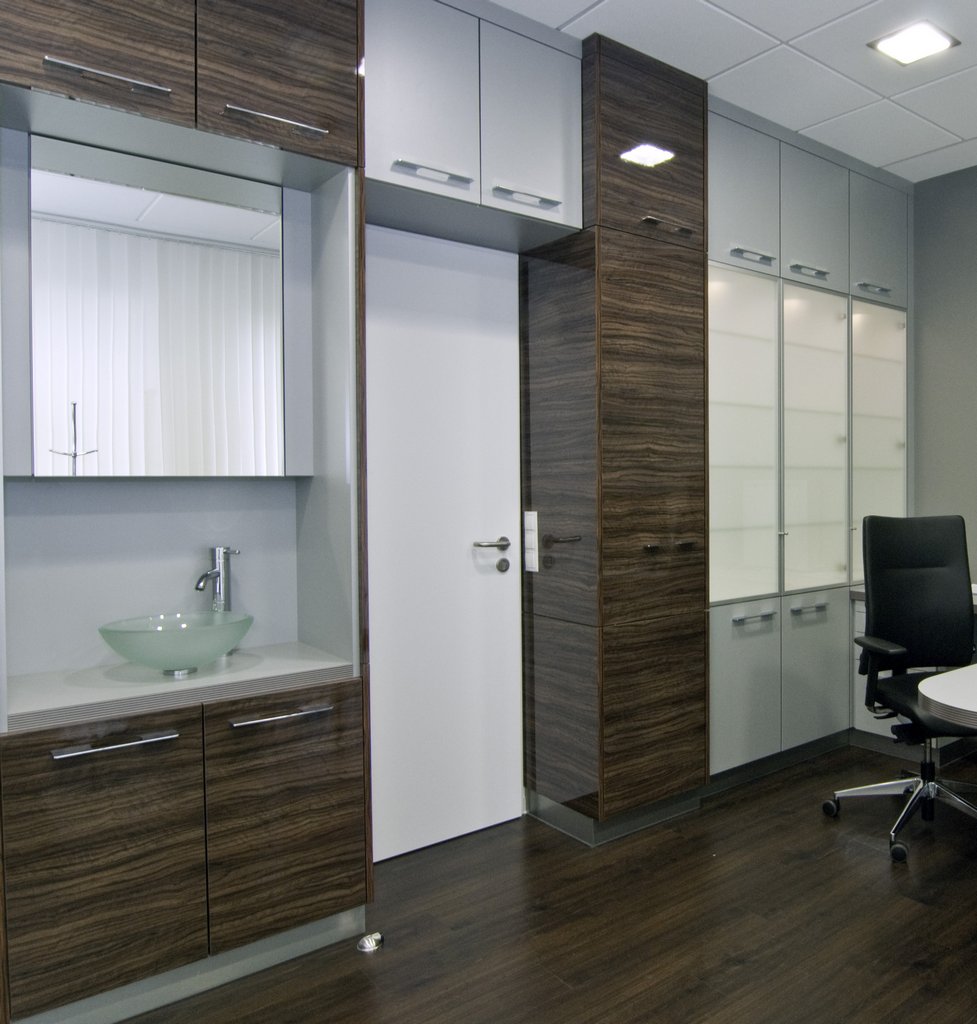 Klein aber fein lautet das Moto dieser Praxis. Es wurde viel Wert auf eine funktionsgerechte Aufteilung der relativ kleinen Fläche gelegt. Durch die Gebäudegeometrie ergab es sich, dass einige Räume ohne Tageslicht auskommen müssen. Durch die offene Gestaltung des Bürobereiches, der nur durch die Möblierung von der Reception getrennt wird, wurde der Eingangsbereich gut belichtet. Die subtile Farbgestaltung in zurückhaltenden Grautönen, in Verbindung mit hochwertigen Materialien, machen den Reiz dieser Praxis aus. Wir erbrachten die Leistungsphasen 1 – 9 der HOAI, die Funktions – und Innenraumplanung, einschließlich der Möbelplanung , das Farb- und Materialkonzept sowie die Planung der Beleuchtung, die auf die hochwertige Gestaltung abgestimmt ist.