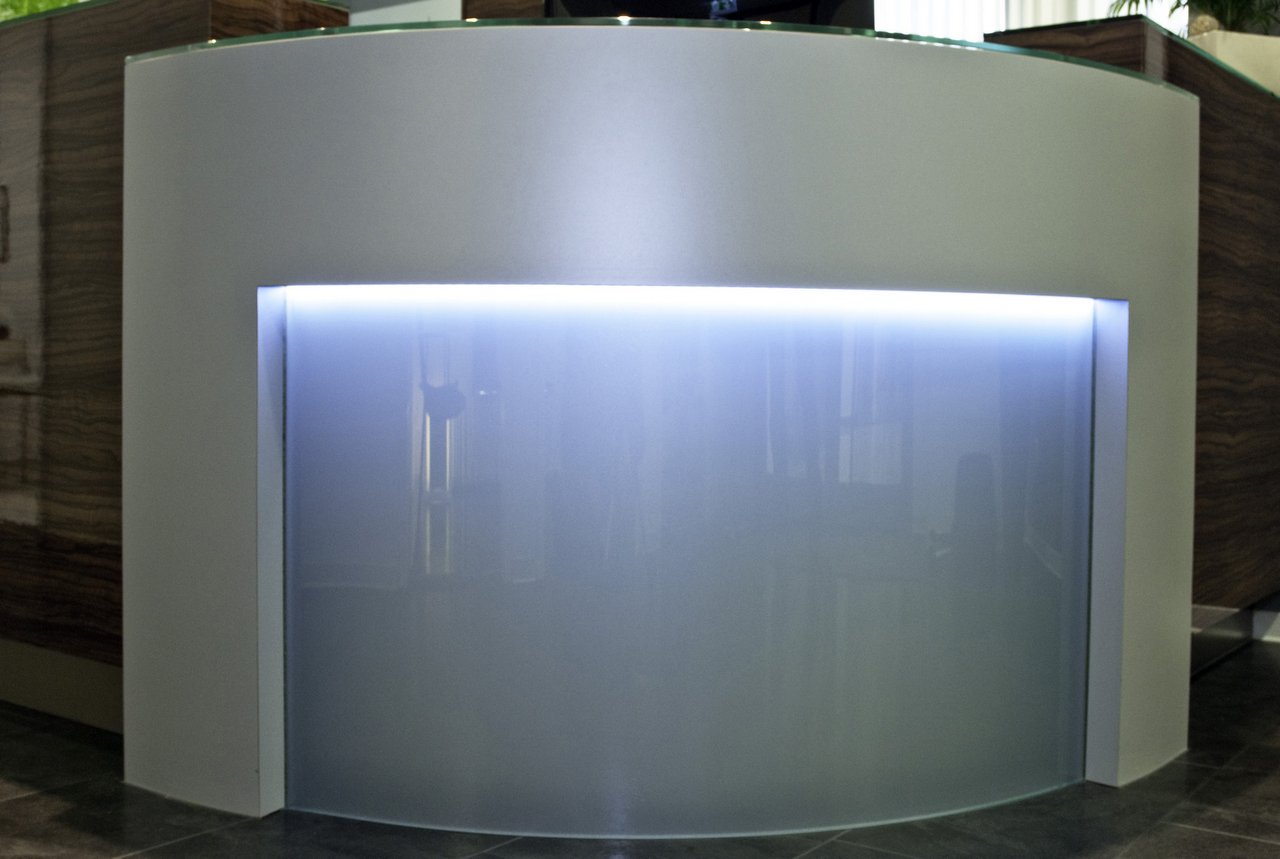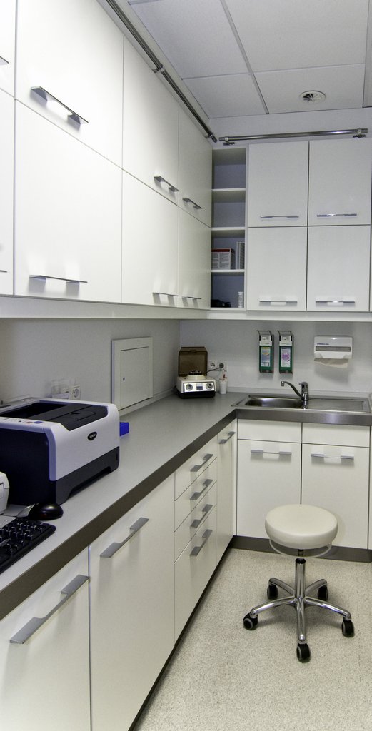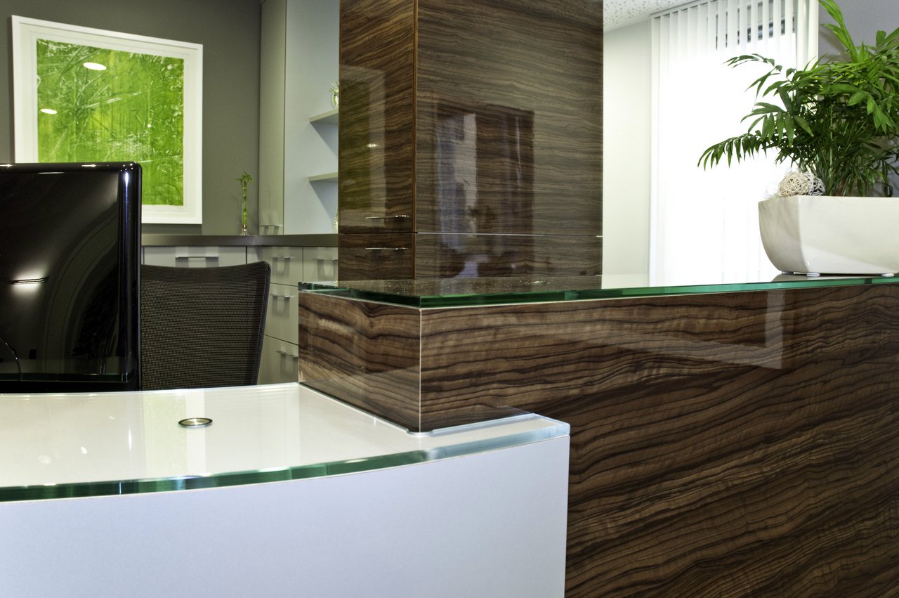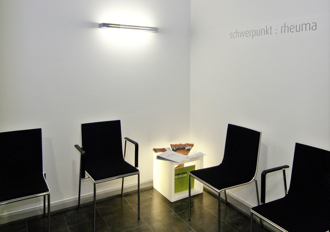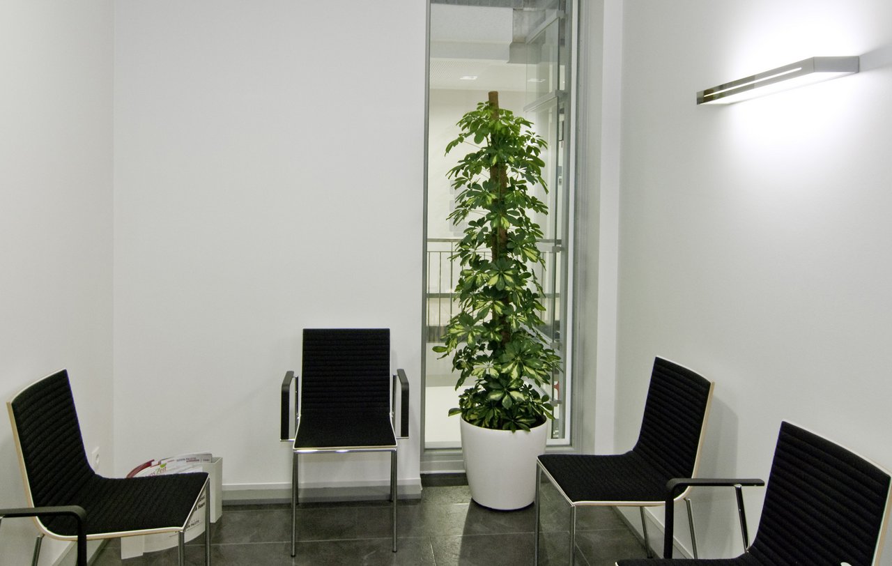 Klein aber fein lautet das Moto dieser Praxis. Es wurde viel Wert auf eine funktionsgerechte Aufteilung der relativ kleinen Fläche gelegt. Durch die Gebäudegeometrie ergab es sich, dass einige Räume ohne Tageslicht auskommen müssen. Durch die offene Gestaltung des Bürobereiches, der nur durch die Möblierung von der Reception getrennt wird, wurde der Eingangsbereich gut belichtet. Die subtile Farbgestaltung in zurückhaltenden Grautönen, in Verbindung mit hochwertigen Materialien, machen den Reiz dieser Praxis aus. Wir erbrachten die Leistungsphasen 1 – 9 der HOAI, die Funktions – und Innenraumplanung, einschließlich der Möbelplanung , das Farb- und Materialkonzept sowie die Planung der Beleuchtung, die auf die hochwertige Gestaltung abgestimmt ist.