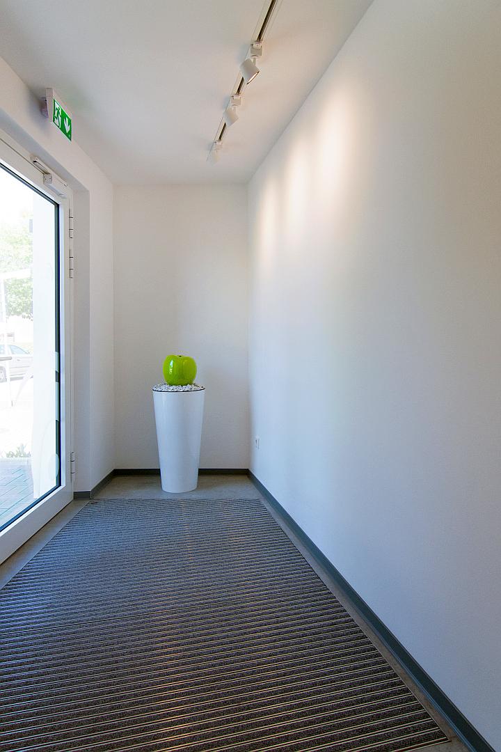 Es bot sich die Chance, die Praxis um die Fläche der daneben liegenden Geschäftsräume, mit einer Größe von ca. 75 m2, zu erweitern. Im gleichen Zuge konnte die unbefriedigende Zugangssituation, durch ein innenliegendes Treppenhaus mit 2 Stufen, grundlegend verändert werden. Dies wurde erreicht durch die Verlegung des Praxiseingangs, so dass es nun einen großzügigen barrierefreien Zugang, von außen, für die Patienten gibt.