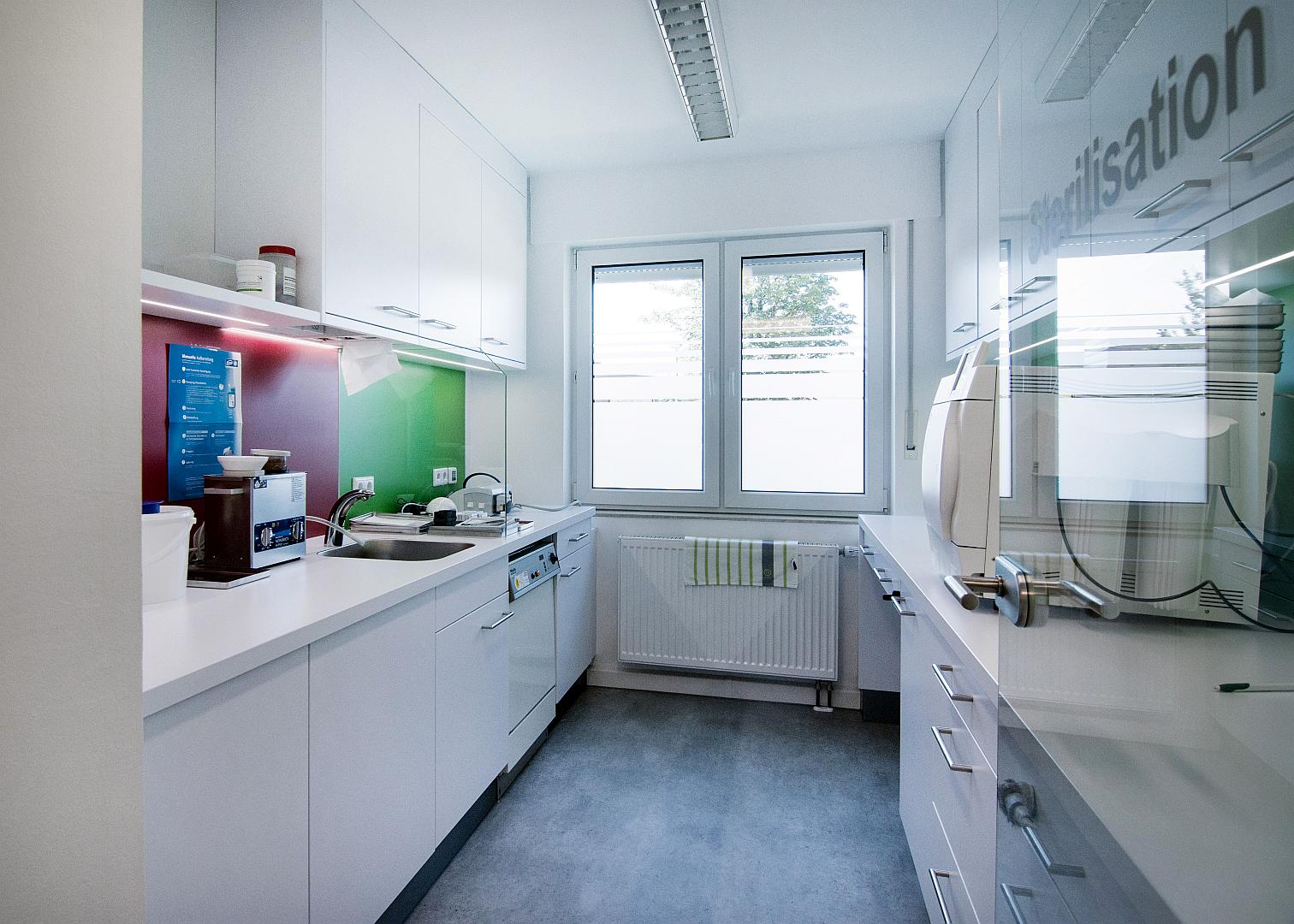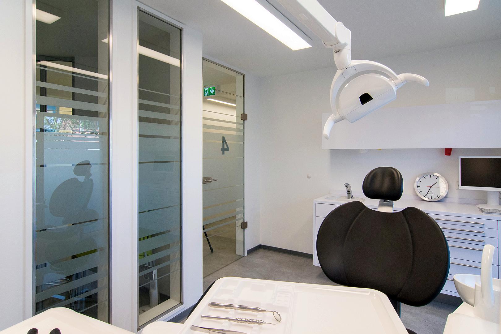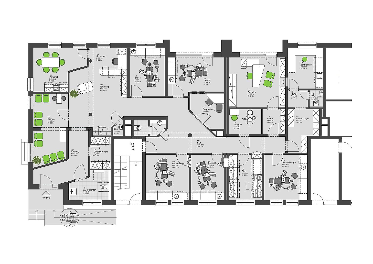 Bei dem vorgestellten Projekt handelt es sich um den Umbau und die Erweiterung einer seit ca. 20 Jahren bestehenden Zahnarztpraxis, mit Schwerpunkt auf der Prophylaxe.