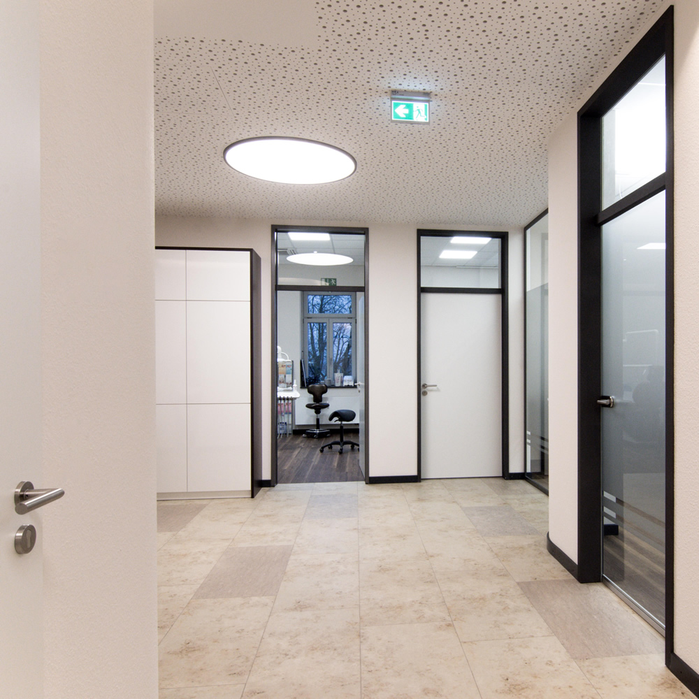 Die Praxisräume wurden, u.a. weil ein weiterer Partner dazu kam, zu klein. Nicht allzu weit vom Praxisstandort entfernt bot sich die Chance, bisher als Büro genutzte Räumlichkeiten, mit einer Gesamtfläche von ca. 330 m² zu beziehen. Da es sich um einen Altbau mit massiven Wänden handelte, die auf Grund statischer Vorgaben zum Teil gar nicht, oder nur mit einem hohen Aufwand zu verändern waren, war es Ziel der Planung, mit möglichst geringen baulichen Änderungen optimale Funktionsabläufe und Räume zu schaffen. Daher wurden im Rahmen der Planung Raumgrößen, Möblierungsvarianten und Positionierung der Behandlungsstühle immer wieder kritisch hinterfragt und variiert. Des Weiteren waren installationstechnische Vorgaben bei der Festlegung der Raumaufteilung und der Möblierung zu berücksichtigen. Der vorhandene Sanitärbereich, sowie ein Teil der sonstigen Nebenräume für die Technik, sowie Lager und Abstellräume, konnten weitestgehend unverändert übernommen werden. Die wesentlichen Grundrissänderungen wurden im Bereich der Behandlungsräume und im Empfangsbereich erforderlich, der vollständig neu aufgeteilt wurde.